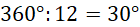Kąt środkowy oparty na łuku między sąsiednimi punktami wynosi 30°.