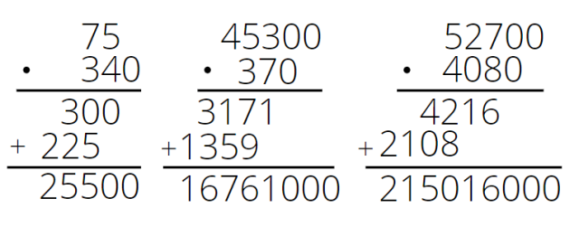 Pomnóż każdą cyfrę pierwszego czynnika przez prawą cyfrę drugiego czynnika, zaczynając od jedności. Jeśli iloczyn będzie dwucyfrowy, to przenieś cyfrę dziesiątek do następnej kolumny, a cyfrę jedności przepisz pod kreską. W następnej kolumnie cyfrę dziesiątek z poprzedniej kolumny dodaj do następnego iloczynu. Podobnie wymnóż cyfry pierwszego czynnika z następną cyfrą drugiego czynnika i zapisz cyfry przesunięte o jedno miejsce w lewo pod spodem. Jeśli mnożysz przez 0, to nie musisz zapisywać wyników (wtedy zapisujesz wyniki mnożenia o 2 miejsca w lewo). Na końcu dodaj pisemnie wyniki pod kreską. Wszystkie zera, które były w obu czynnikach dopisujesz do wyniku.