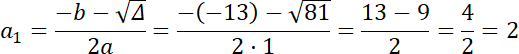 ∆ = b2 – 4ac = (–13)2 – 4 · 1 · 22 = 81