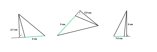 W trójkącie rozwartokątnym wysokość może znajdować się na zewnątrz trójkąta. Wymagane jest narysowanie przerywanych linii będących przedłużeniami podstaw.