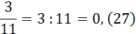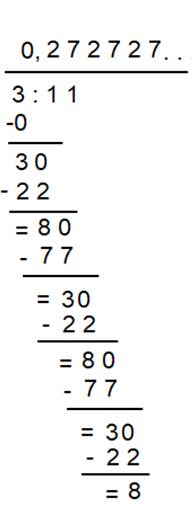 Na podstawie poniższych obliczeń, wyraźnie widać, że można by się zapętlić w notorycznym odejmowaniu dwóch par liczb (80 – 77 oraz 30 – 22), co daje powtarzającą się kombinację cyfr 2 i 7, a więc używamy zapisu ułamka okresowego dla ułatwienia rozumowania.