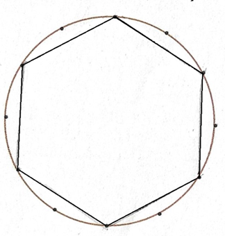 Narysuj sześciokąt foremny, wybierając odpowiednie punkty na okręgu, wiedząc, że są równoodległe od siebie.