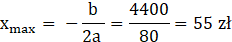 Poszukujemy współrzędną wierzchołka paraboli, która opisuje zysk ze sprzedaży, bo współczynnik przy najwyższej potędze jest ujemny, więc funkcja tam osiąga wartość największą. Kolejnym krokiem jest poznanie wartości, dla tego argumentu i ta wartość jest równa zyskowi.