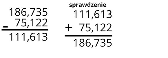 Odejmij ułamki 186,735 + 75,122 i sprawdź wynik.