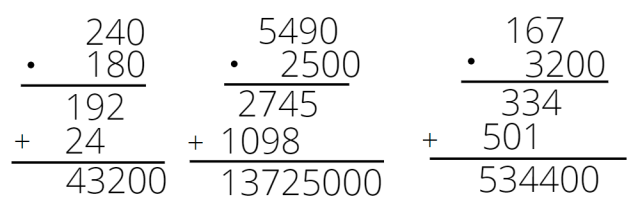 Pomnóż każdą cyfrę pierwszego czynnika przez prawą cyfrę drugiego czynnika, zaczynając od jedności. Jeśli iloczyn będzie dwucyfrowy, to przenieś cyfrę dziesiątek do następnej kolumny, a cyfrę jedności przepisz pod kreską. W następnej kolumnie cyfrę dziesiątek z poprzedniej kolumny dodaj do następnego iloczynu. Podobnie wymnóż cyfry pierwszego czynnika z następną cyfrą drugiego czynnika i zapisz cyfry przesunięte o jedno miejsce w lewo pod spodem. Jeśli mnożysz przez 0, to nie musisz zapisywać wyników (wtedy zapisujesz wyniki mnożenia o 2 miejsca w lewo). Na końcu dodaj pisemnie wyniki pod kreską. Wszystkie zera, które były w obu czynnikach dopisujesz do wyniku.
