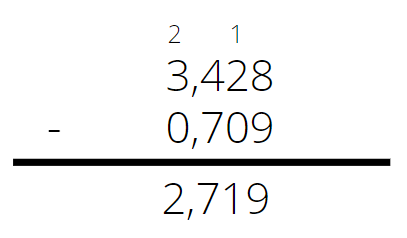 Działanie pisemne wykonuj tak, jak w przypadku liczb naturalnych. Przecinek musi być zawsze jeden pod drugim. Tak samo części ułamkowe muszą być pod częściami ułamkowymi i części całości pod całościami. Potem odejmujesz części tysięczne od części tysięcznych, części setne od setnych itd. Tak jak w odejmowaniu liczb rzeczywistych, możesz „pożyczać” jedną dziesiątkę. Robisz tak wtedy, gdy liczba „u góry” jest za mała, żeby odjąć tę „na dole”.
