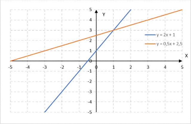 Układy te są układami oznaczonymi, co świadczy o tym, że proste przecinają się w jednym punkcie i mają jedno rozwiązanie. Aby przedstawić interpretację geometryczną, należy równania doprowadzić do postaci kierunkowej tzn. y = ax + b, następnie narysować w jednym układzie współrzędnych i odczytaj punkt przecięcia prostych, będący rozwiązaniem tego układu.