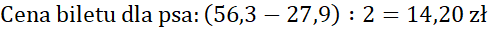 Oblicz cenę biletu dla psa, jeśli za trasę 60 km z dwoma psami zapłaciła 56,30 zł.