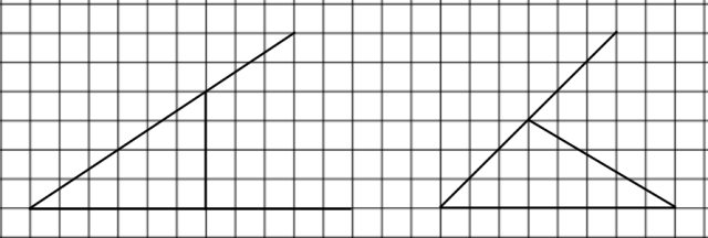 Narysowano trójkąty o przyprostokątnych 3 cm i 2cm i trójkąt o wysokości 1,5 cm i 4 cm.