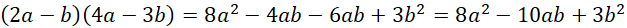 Mnożenie wykonaj w taki sposób, aby każdy element nawiasu pierwszego był pomnożony przez każdy element nawiasu drugiego. Tak otrzymane wyrazy zsumuj.