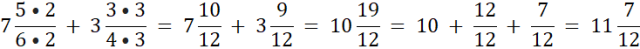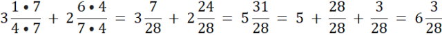 W pierwszym przykładzie wspólnym mianownikiem części ułamkowej to iloczyn 4 • 7 = 28. Sprowadź mianowniki do 28.