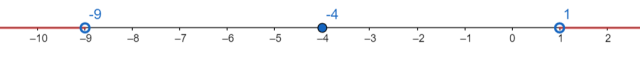 Zaznacz na osi wszystkie te punkty, których odległość od -4 jest większa od 5. Nierówność jest ostra (|x – (-4)| > 5), więc przedział jest otwarty.