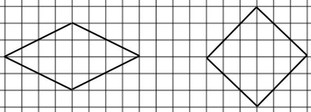 Narysowano romb o przekątnych 2 cm i 4 cm oraz 3 cm i 3 cm.