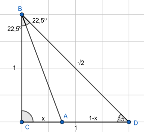 Zauważ, że w tym przypadku przyprostokątna ma długość 1 i znajduję się ona naprzeciwko największego kąta, więc długość jego przyprostokątnych wynosi 1.