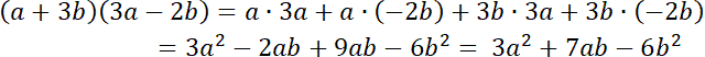 Pomnóż każdy wyraz znajdujący się w jednym nawiasie przez każdy wyraz z drugiego nawiasu, a następnie zredukuj wyrazy podobne, czyli dodaj/odejmij jednomiany podobne.
