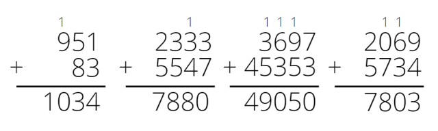 Dodajesz jedności, dziesiątki, setki itd. osobno. Jeśli suma w kolumnie jest liczbą dwucyfrową, to cyfrę dziesiątek w tej liczbie przenosisz do następnej kolumny i dodajesz ją z pozostałymi liczbami w kolumnie, a cyfrę jedności wpisujesz pod kreską.