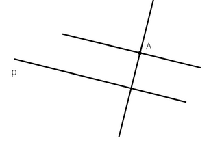Używając ekierki i linijki, poprowadź przez punkt A prostą równoległą i prostopadłą do prostej p.