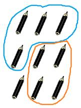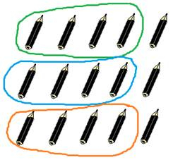 Podziel ołówki tak, aby powstały zestawy po cztery sztuki. Następnie zapisz działanie, które pozwoli obliczyć ci, ile stworzyłeś zestawów i ile ołówków pozostało bez zestawu.