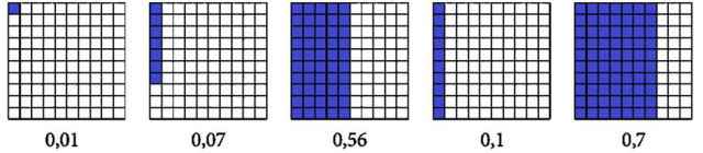 Kwadrat jest podzielony na mniejsze kwadraciki. Jest ich 100. Oznacza to, że zakolorujesz pewną liczbę kwadratów ze 100. 0,01 ze 100 to 1. 0,07 ze 100 to 7. 0,56 ze 100 to 56. 0,1 ze 100 to 10. 0,7 ze 100 to 70.