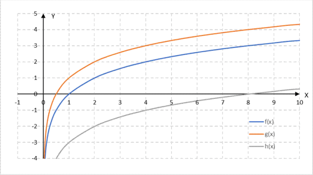 W tym zadaniu narysuj w jednym układzie współrzędnych wykresy funkcji: f(x) = log2 x, g(x) = log2 x + 1, h(x) = log2 x – 3. Następnie podaj wartości każdej z tych funkcji dla x ∈ {
