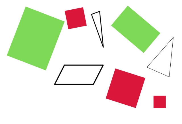 Zamaluj na czerwono kwadraty, a na zielono prostokąty, które nie są kwadratami.