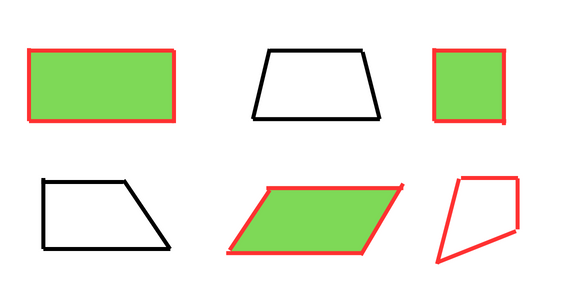 W tym zadaniu musisz zaznaczyć na czerwono czworokąty, które mają dwie pary boków tej samej długości, a na zielono – czworokąty, które mają dwie pary boków równoległych.