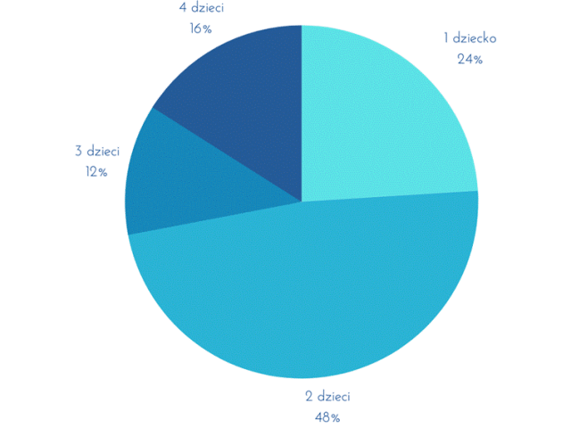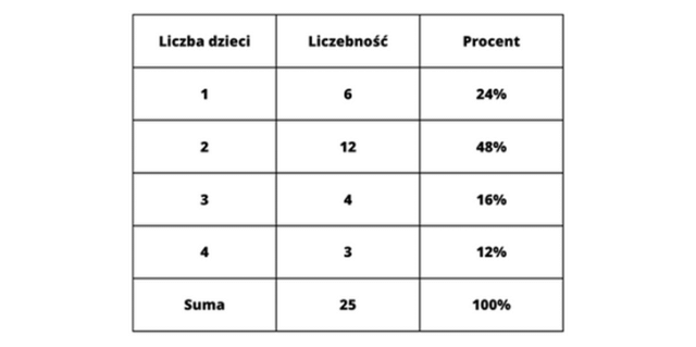 W tym zadaniu dane dotyczące liczby dzieci w ich rodzinie: 1, 2, 3, 2, 3, 1, 4, 2, 3, 2, 2, 2, 1, 4, 2, 1, 1, 2, 2, 3, 2, 2, 4, 1, 2 zaprezentuj w postaci diagramu kołowego.