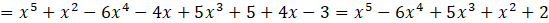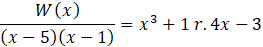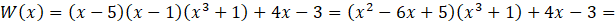 Aby wyznaczyć wzór wielomianu W(x) zapisz wielomian w postaci W(x) = (x – 5)(x – 1)(x3 + 1) + 4x – 3. Następnie wymnóż nawiasy i zredukuj jednomiany podobne. Otrzymasz w ten sposób wielomian W(x) w postaci uporządkowanej.