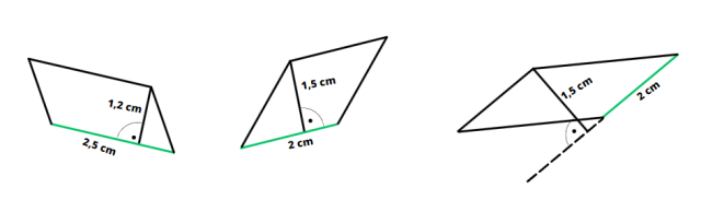 By obliczyć pole równoległoboku, należy pomnożyć przez siebie jeden z jego boków i wysokość opuszczoną na ten bok (wysokość musi leżeć pod kątem prostym do boku). Wysokość może znajdować się na przedłużeniu boku równoległoboku.