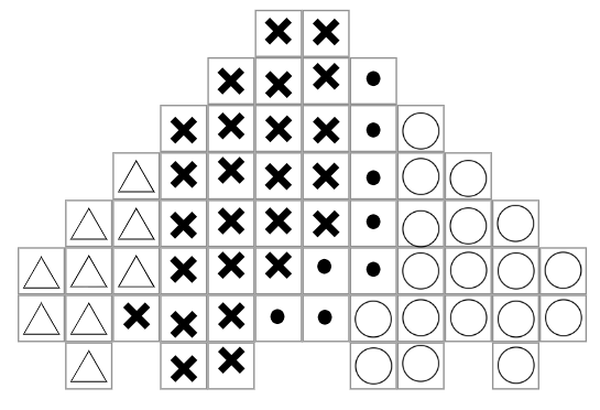 Domaluj na rysunku kropki, kółka, krzyżyki, by pola stanowiły odpowiednią część figury.