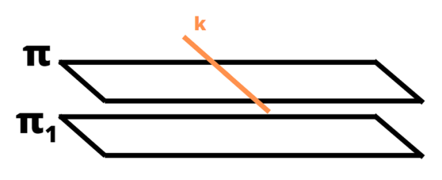 Płaszczyzna π1 i prosta k nie mają punktów wspólnych, ponieważ płaszczyzny π i π1 są do siebie równoległe, ale nie pokrywają się ze sobą. Narysuj takie płaszczyzny.