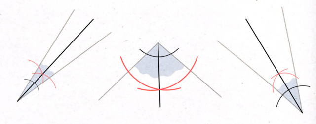 Najpierw umieść cyrkiel w wierzchołku kąta i narysuj łuk. Łuk wyznaczy Ci punkty na ramionach kąta, z których ponownie musisz narysować łuki. Miejsce przecięcia się łuków (pomarańczowych) to punkt, przez który przechodzi dwusieczna kąta.