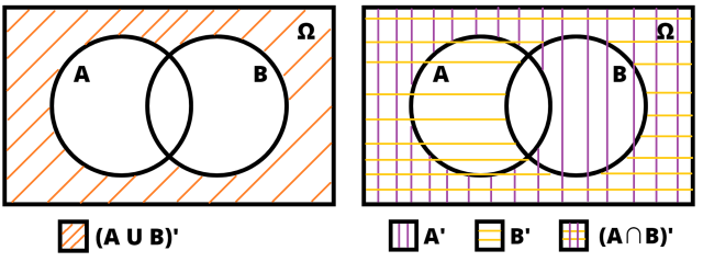 Narysuj dwa okręgi (A i B) w przestrzeni Ω. Na pierwszym diagramie zaznacz obszar poza okręgami, a na drugim zaznacz najpierw obszar poza okręgiem A, następnie obszar poza okręgiem B. Część wspólna obszarów na drugim diagramie pokrywa się z obszarem na pierwszym diagramie, c. n. d.