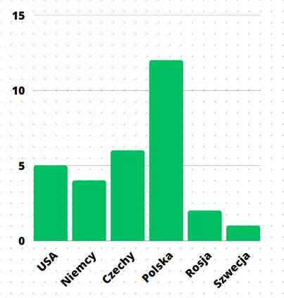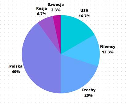 | Kraj pochodzenia uczestników | USA | Niemcy | Czechy | Polska | Rosja | Szwecja |