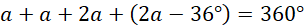 Oznaczam jeden z kątów jako ‘a’. W czworokącie suma miar wynosi 360°. Równanie: