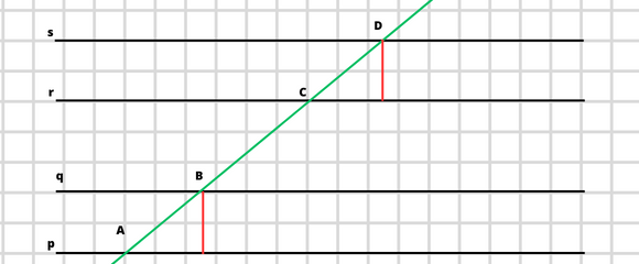 Ponieważ proste p, q, r i s są równoległe, to przecinające je prosta t tworzy kąty odpowiadające i naprzemianległe i odpowiadające. Wraz z kątem prostym między odcinkiem obrazującym jednakową odległość między prostymi, trójkąty są przystające. Odcinki AB i CD muszą mieć równą miarę ze względu na przystawanie trójkątów.