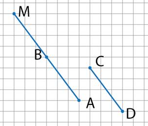 W tym zadaniu musisz zaznaczyć w zeszycie w kratkę trzy punkty: A, B i C tak jak na rysunku. Następnie musisz narysować odcinki CD i BM równe odcinkowi AB, przy czym odcinek AB powinien być równoległy do odcinka CD. Punkt B znajduje się na dolnym końcu odcinka BM, a punkt C na górnym końcu odcinka CD.