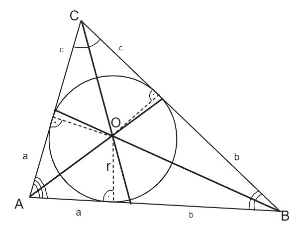 Zauważ, że punkt O leży na przecięciu się pół prostych AO i AB. Poprowadź z punktu O odcinki łączące ten punkt z bokami trójkąta. Powtórz to samo dla każdej pary dwusiecznych.