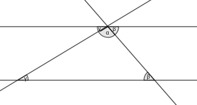 Jeśli dane są dwie proste równoległe przecięte trzecią prostą, to kąty naprzemianległe mają równe miary, więc: