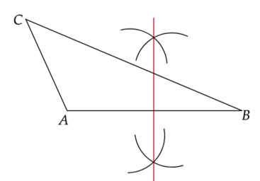 Zacznij od wyznaczenia symetralnej odcinka AB. Odmierz cyrklem odcinek większy niż połowa odcinka AB. Wbij jego nóżkę w punkt B i zakreśl po obu stronach odcinka łuki. Nie zmieniając rozmiaru cyrkla, wbij nóżkę w punkt A i ponownie zakreśl łuki po obu stronach odcinka. Narysuj prostą przechodzącą przez przecięcia tych łuków.