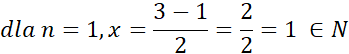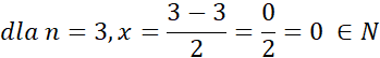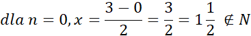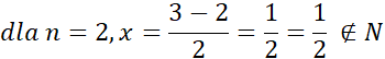 Wartość licznika x nie może być ujemna, a więc n musi być mniejsze lub równe 3. Następnie podstaw kolejne wartości