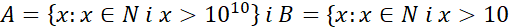 Zbiór A zawiera wszystkie liczby naturalne większe od 1010, a zbiór B zawiera wszystkie liczby naturalne większe od 10, a więc zbiór A jest podzbiorem zbioru B.