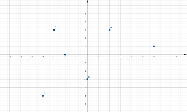Punkty A(2, 3), B(6, 1), C(-3, 3), D(-4, -5), E(0, -3) i F(-2, 0) zaznacz na układzie współrzędnych.