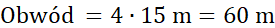 Obwód kwadratu o boku 15 m wynosi 60 m.