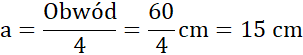 Kwadrat o obwodzie 60 cm ma bok długości 15 cm.