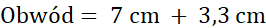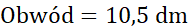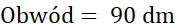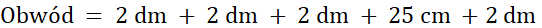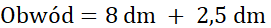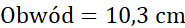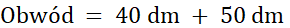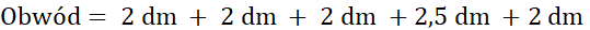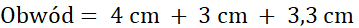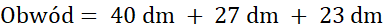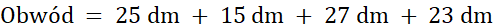 Obwód wielokąta jest sumą jego wszystkich boków; pamiętaj, że liczby muszą być w tej samej jednostce.