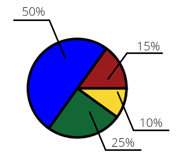 Przeprowadzono ankietę pod tytułem: „Który z czterech kolorów lubisz najbardziej: zielony, żółty, niebieski czy czerwony?”. Najmniej osób wybrało kolor żółty, jedna czwarta wybrała kolor zielony, a połowa – niebieski. Pokoloruj diagram odpowiednimi kolorami i wpisz, ile procent osób wybrała kolor czerwony.