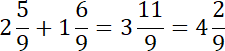 Aby wykonać to dodawanie, musisz dodać najpierw do siebie cyfry oznaczające całości, a następnie do siebie dodać liczniki (cyfry nad kreską ułamkową) ułamków. Jeśli licznik po dodaniu jest taki sam jak mianownik, oznacza to, że możesz zamienić ułamek na jedną dodatkową cyfrę całości, jeśli jednak licznik jest większy od cyfry pod kreską ułamkową, to musisz dodać jedną dodatkową cyfrę całości, oraz zapisać ułamek zwykły, w którym cyfra pod kreską ułamkową będzie taka sama, a cyfra nad kreską ułamkową będzie różnicą (wynikiem odejmowania) licznika i mianownika.