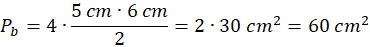 Powierzchnia boczna to 4 identyczne trójkąty o podstawie 5 cm i wysokości 6 cm.