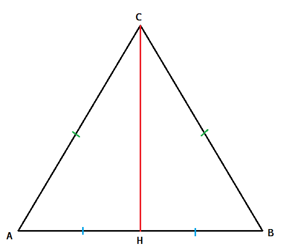 Trójkąty AHC oraz BHC są przystające na mocy zasady bok – bok – bok. Z tego wynika, że miary odpowiadających sobie kątów (w szczególności AHC i BHC) są sobie równe. AHC i BHC są kątami przyległymi, więc ich miary sumują się do 180 stopni. W związku z tym oba kąty AHC i BHC są proste, a środkowa AH jest jednocześnie wysokością trójkąta.